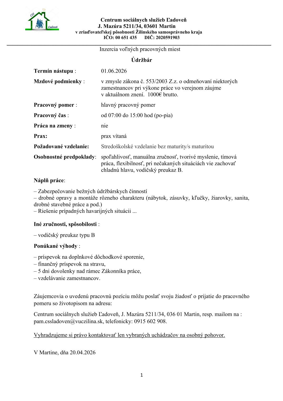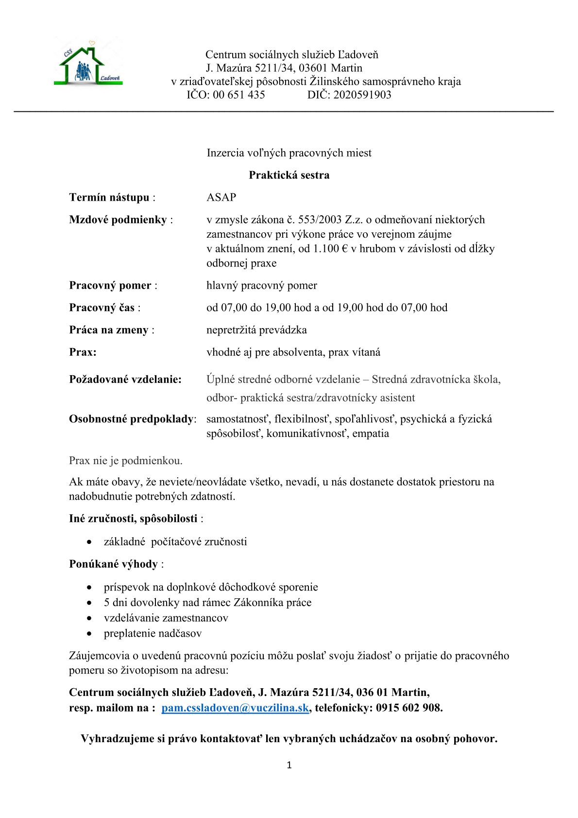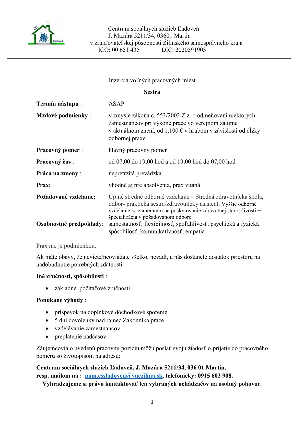 Úvodné informácie pre záujemcov o sociálnu službu v CSS Ľadoveň